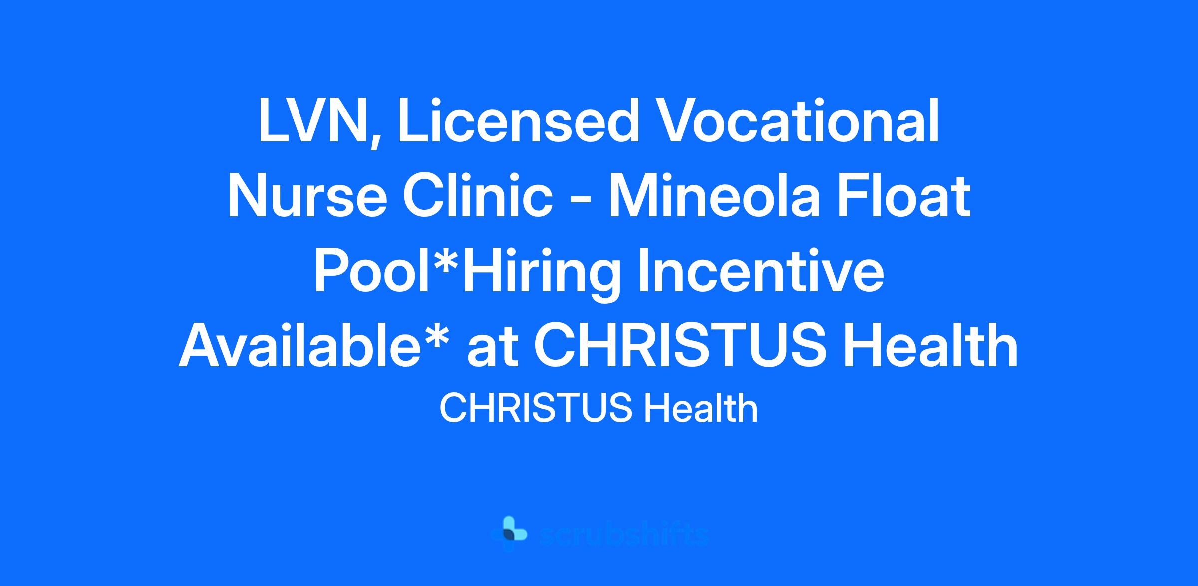 LVN, Licensed Vocational Nurse Clinic - Mineola Float Pool*Hiring Incentive Available* at CHRISTUS Health