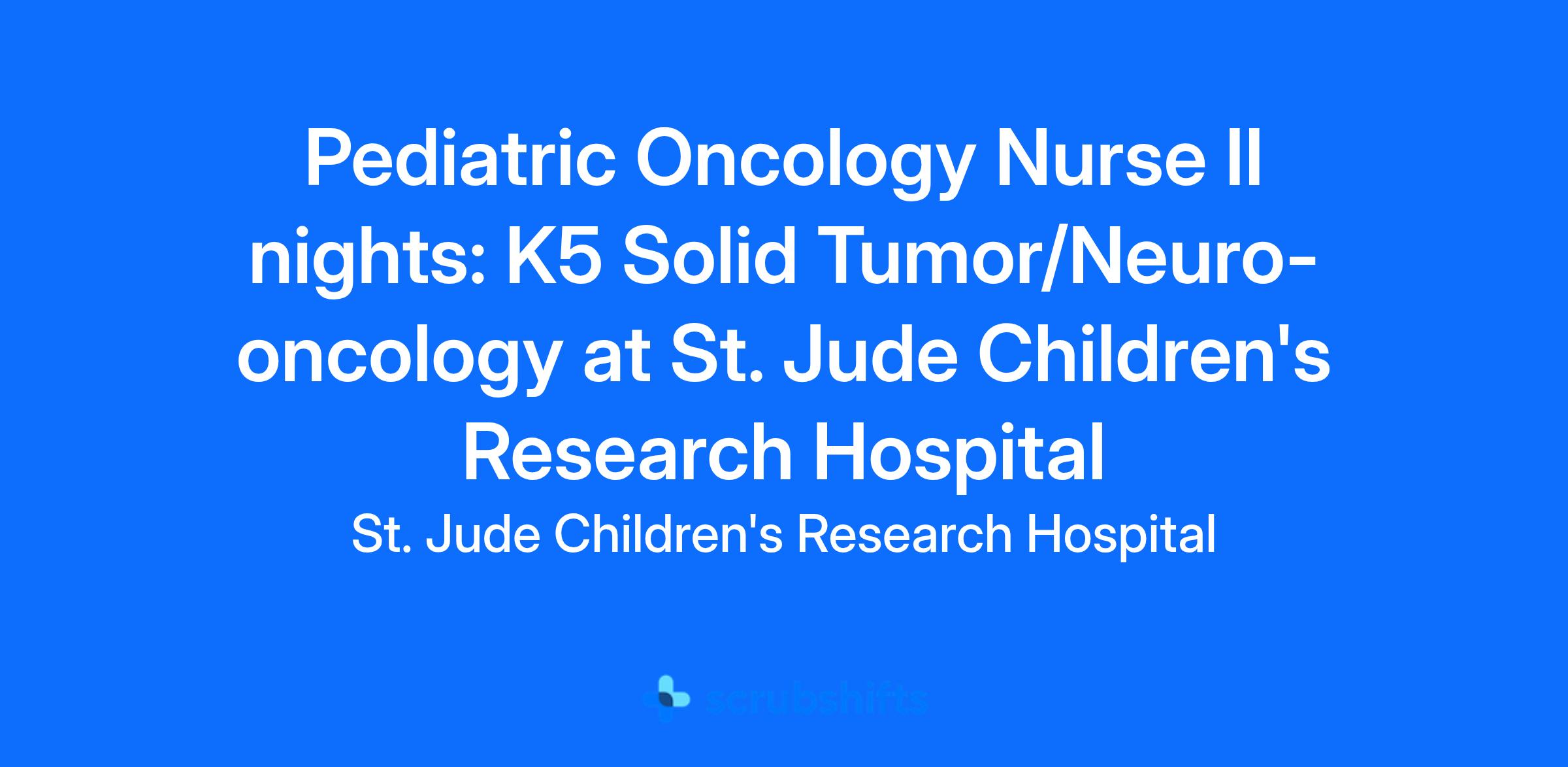 St. Jude is looking for a **Pediatric Oncology Nurse for Kay 5**, which supports patients who are diagnosed with solid tumors or neuro\\-oncology disorders. Be a part of groundbreaking cell therapies or antibody infusions that work to improve outcomes in this patient population. Kay 5 is a 17\\-bed unit that offers small nurse to patient ratios. Come join a prestigious nursing team who provides the highest quality of care, every day!