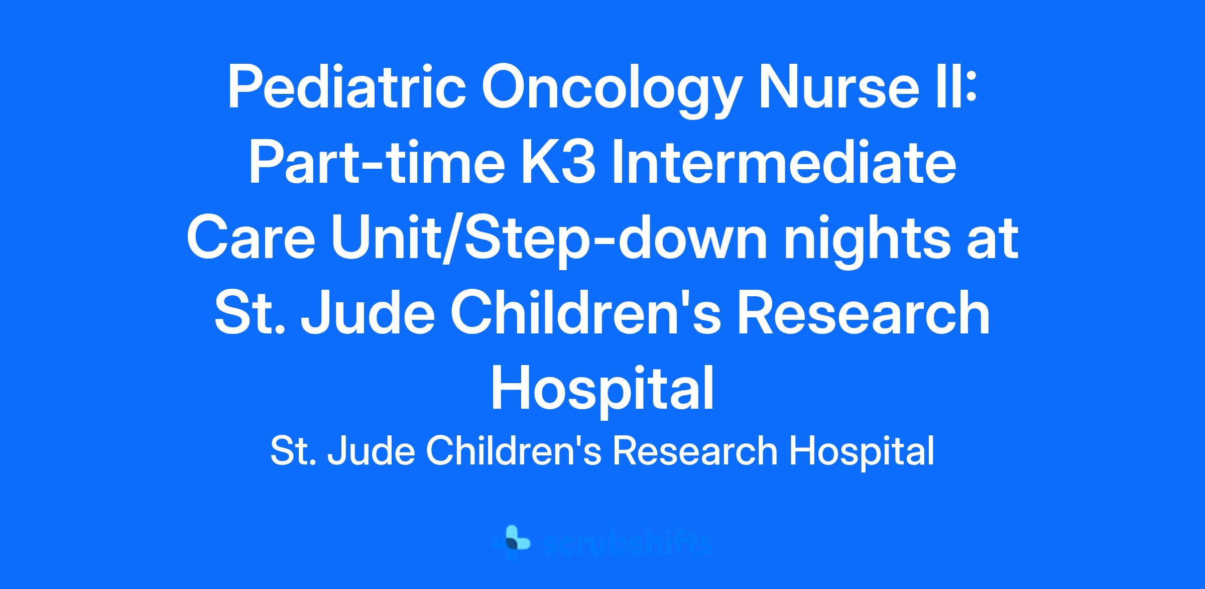 In recognition of certain U.S. state and municipal pay transparency laws, St. Jude is including a reasonable estimate of the compensation range for this role. This is an estimate offered in good faith and a specific salary offer takes into account factors that are considered in making compensation decisions including but not limited to skill sets, experience and training, licensure and certifications, and other business and organizational needs. It is not typical for an individual to be hired at or near the top of the salary range and compensation decisions are dependent on the facts and circumstances of each case. A reasonable estimate of the current salary range is $31\\.50 \\- $55\\.00 per hour for the role of Pediatric Oncology Nurse II: Part\\-time K3 Intermediate Care Unit/Step\\-down nights.