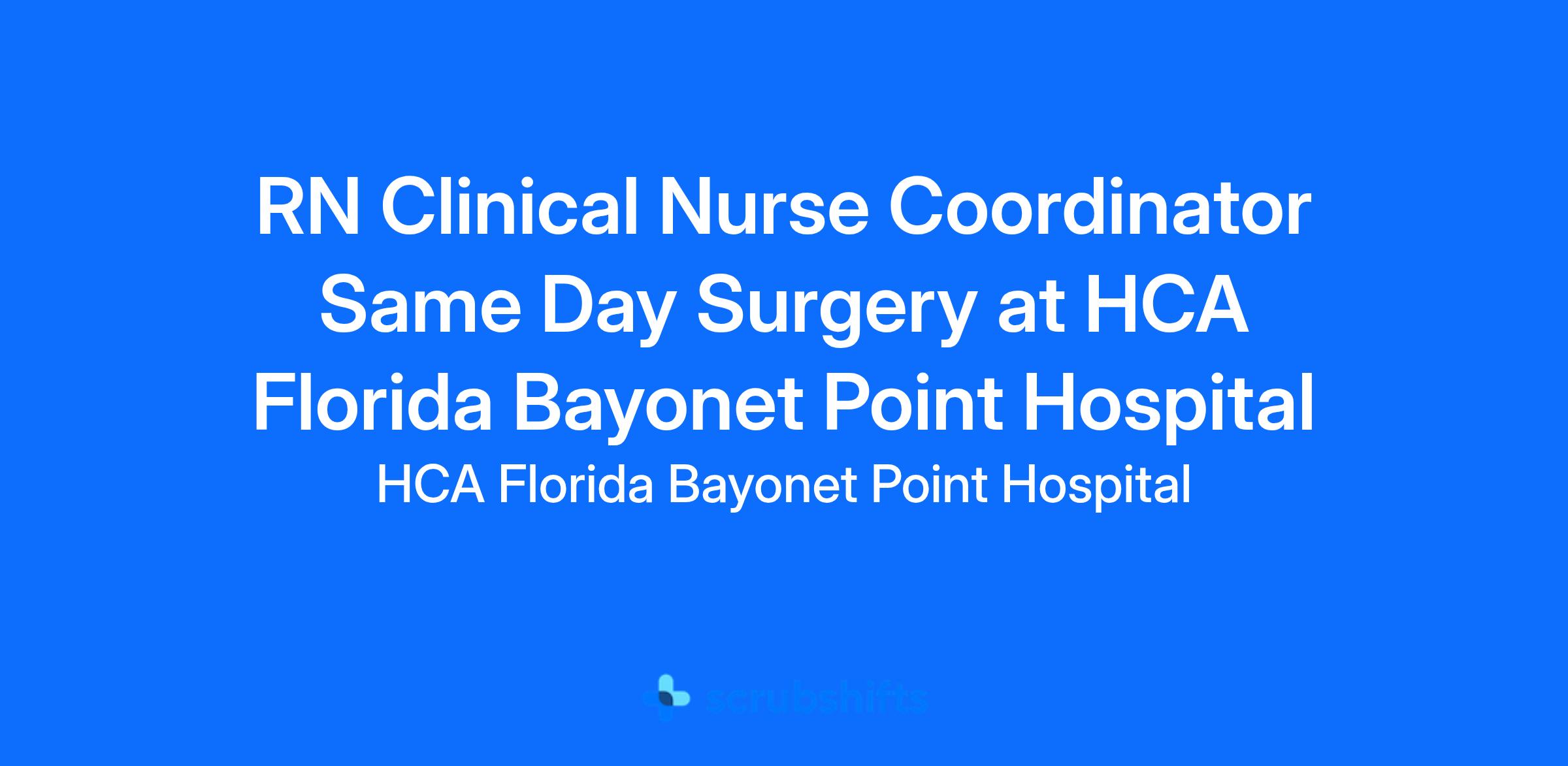 HCA Florida Bayonet Point Hospital is committed to investing in the latest technology enabling nurses to work more efficiently. **Are you passionate about delivering patient\\-centered care?** Submit your application for RN Clinical Nurse Coordinator Same Day Surgery position and spend more time at the bedside with the patient.