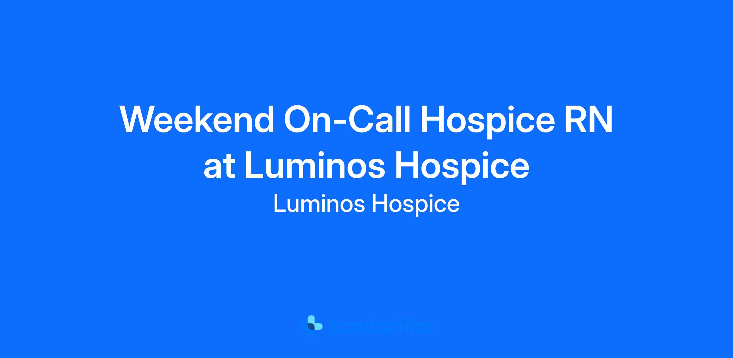**Job overview:** Luminos Hospice is seeking a skilled and compassionate On\\-Call RN to join our weekend team. As an On\\-Call RN, you will be responsible for providing quality care to our patients during weekends. Primary functions are to administer nursing care for patients of all ages in their place of residence and to coordinate care with the Interdisciplinary Group/Team, patients, families, and referring agency. Assumes the responsibility for, and participates in, the coordination of care.